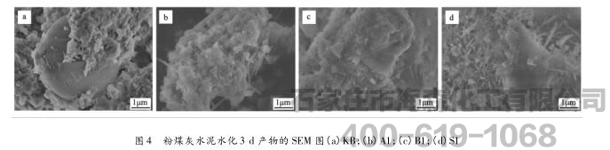 从图4的SEM图可以看出,未加助磨剂的空白样中水泥颗粒表面光滑,大部分粉煤灰颗粒都没有参加水化反应。而其余的三个实验组虽然也可从图中看到很多光滑的未参加反应的表面,但总体而言,反应都比KB组更充分。在A1和S1中有大量的棒状钙矾石晶体生成,这与3d的XRD图分析结果一致。在B1中,虽然钙矾石的生成量不及A1、S1中的多,但是片层的氢氧化钙和絮状的水化硅酸钙凝胶含量更多。水化硅酸钙凝胶体对水泥石的强度起着决定性作用, 这也是 B1 早期强度高于其他组的原因。