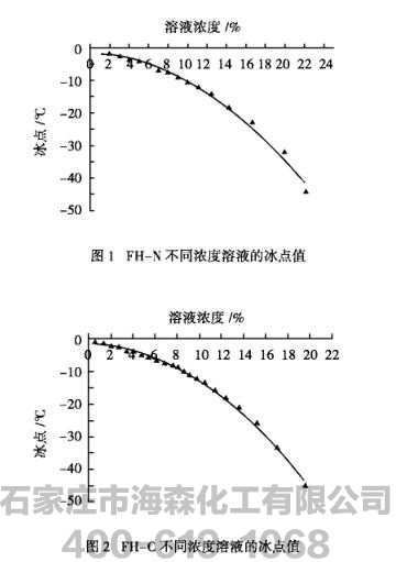 由图1、图2可见,当FH-N溶液浓度为22.2%时,液相冰点可达-44.1℃,FH-C溶液浓度为19.56%时,液相冰点可达到-45℃;而在相同液相浓度情况下,FH-C的冰点较FH-N的冰点值更低一些。