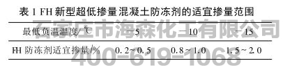 在2006年2月就超低掺量混凝土防冻剂新型材料的开发进行了联合攻关,并在此领域进行了深入的研究与工程应用,取得了大量的技术数据,并将此新型超低掺量防冻剂暂定名为FH新型超低掺量混凝土防冻剂,分为两个系列产品,分别为FH-N、FH-C,其最大的特点为冰点值极低、无氯、微碱含量、超低掺量,较传统防冻剂的掺量降低800%~1000%。