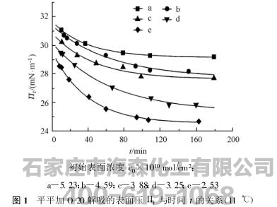 平平加O-20)为样品,采用表面单分子膜铺展技术,研究其单分子膜的表面压与时间关系,分析并得到单分子膜中模型分子的解吸扩散系数。