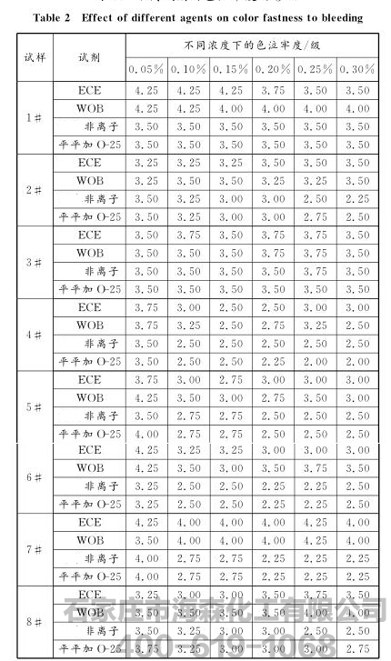 平平加O-25与日本非离子表面活性剂对8种不同织物的促进扩散效果完全一样,各色泣牢度值一样;但选用ECE、WOB试剂所测结果与日本非离子表面活性剂所测结果仍有偏差。