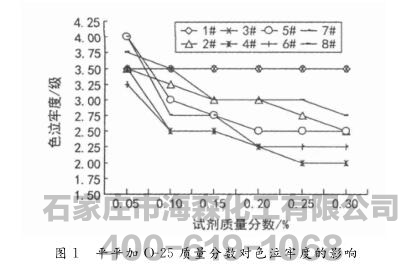 平平加O-25浓度不断加大,1#和3#织物的色泣牢度没有任何变化,说明0.05%的