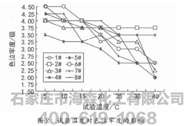 平平加O-25已能使1#织物上染料充分扩散,且受温度影响大。这也是锦纶织物染色牢度不佳的体现);其次为8#和6#织物,分别降低2.25级和2.00级;3#和7#织物均降低了1.75级;变化最小的是2#织物,仅降低了0.25级。