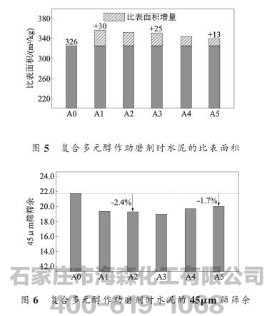 复合多元醇A1~A3的助磨效果明显优于A4和A5,前者可以使比表面积提高25~30m2/kg,45μm筛筛余降低2.4%~2.8%,后者提高比表面积不超过20m2/kg,降低45μm筛筛余1.7%~2.1%。