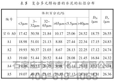 激光粒度测试结果见表5。复合多元醇A1~A5明显增加了水泥5.5μm以下的细颗粒含量,减少了40μm以上的粗颗粒含量,使水泥中位粒径D50和体积平均粒径Dav明显减小,助磨效果较好。A3的丙二醇含量最高,粉磨的水泥细颗粒较多,粗颗粒较少,D50和Dav最小,助磨效果最好。从D50和Dav来看,助磨效果依次为A3>A2>A1>A4>A5。