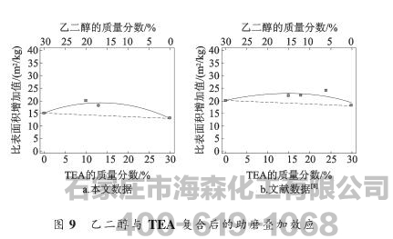 乙二醇与TEA复合后的助磨效果见图9(a)中的弧形实线,明显大于它们的加权平均值(虚线),这说明乙二醇与TEA复合具有助磨叠加效应。通过分析文献资料[8]中的数据,进一步证实了这一点,如图9(b)所示。