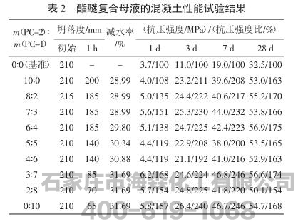 聚羧酸减水剂具有减水率高、坍损快、强度高等特点;而PC-2聚醚型减水剂虽强度和减水率稍低,但确具有十分优异的保坍性能。