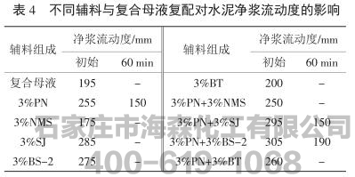 (1)单掺辅料时,除NMS外,其余辅料与母液对水泥均有不同程度的协同分散作用,其中以SJ、BS-2、PN最为明显,但是单掺辅料PN的净浆经时流动度损失最小,而其余辅料60min后净浆流动度几乎全部损失,说明PN与母液的协同保塑性最好。