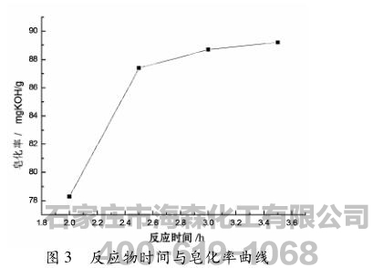 三乙醇胺按1.2∶1(mol/mol)加入三反应不同的时间,取反应液分别测定酸值和皂化值。扣除酸值后的皂化值与反应时间的关系见图3。口烧瓶中,加热搅拌,控制反应温度在120℃,分别反应不同的时间,取反应液分别测定酸值和皂化值。扣除酸值后的皂化值与反应时间的关系见图3。