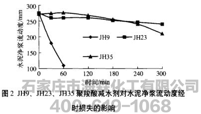 图2为JHg、JH23、JH35聚梭酸减水剂对水泥净浆流动度经时损失的影响,减水剂掺量为水泥质量的.05%。由该图可知,JH23、JH35聚梭酸减水剂掺人水泥净浆中经时损失小,尤以JH23聚梭酸减水剂为佳,而JHg掺人水泥净浆中经时损失大。可见侧链较长的聚梭酸减水剂对水泥净浆的流动度保持有利,这是因为多梭酸系共聚物为梳形柔性吸附,其疏水基团吸附在水泥颗粒表面,聚醚侧链向外伸展,侧链较长的聚梭酸减水剂空间位阻比侧链较短的聚梭酸减水剂空间位阻大,同时因为聚梭酸减水剂中侧链以醋键的形式与主链连接,在碱性环境中发生缓慢分解而释放梭基,侧链较长的聚梭酸减水剂梭基释放时间相对较长,从而使流动度经时损失小,有利于流动度保持。