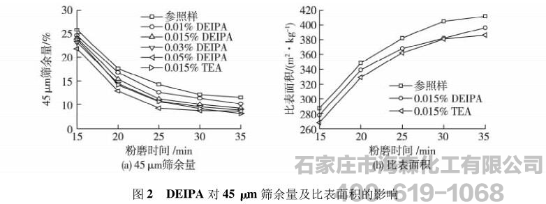 1)DEIPA有效促进了水泥粉磨过程,掺0.015%的DEIPA的水泥粉磨25min即可获得和参照样粉磨35min相近的45μm筛余量。掺入DEIPA的水泥粉磨试样的Blaine比表面积均较参照样降低,这和DEIPA改变了水泥粉体在Blaine法测定介质中的透气性有关。