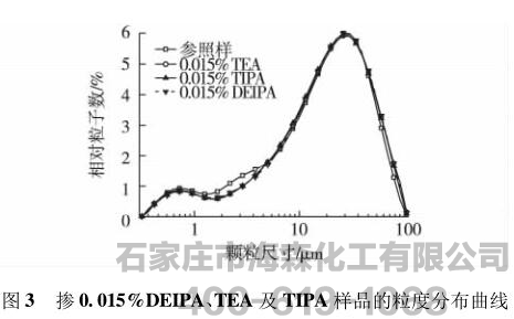 采用MicrotracS3500SI型激光粒度粒形分析仪测定了粉磨25min后各水泥物料的粒度分布。图3是掺0.015%DEIPA、TEA及TIPA粉磨25min的水泥粉体的粒度分布曲线。从图3可见:掺不同链烷醇胺的水泥粉体中小于5μm区间水泥颗粒含量均明显低于参照样,这和工业粉磨生产中水泥助磨剂能够改善过粉磨的效果基本一致.
