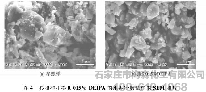 2)DEIPA在粉磨过程中的助磨特性与TEA及TIPA相似。掺入0.015%的DEIPA、TEA及TIPA均降低了小于5μm区间的微细颗粒含量,改变了水泥粉体的粒度分布,从而消除了研磨体表面的“垫层”及过粉磨现象。
