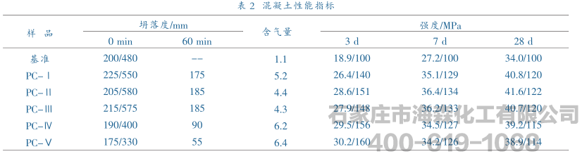 聚羧酸减水剂对混凝土坍落度大小、坍落度经时损失、含气量以及强度的影响。如表2。