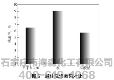 从图5中可知硅酸钠的洗涤效果最好,残油率仅有5.3%,这是因为硅酸钠具有分散剂的作用,能有效降低液-液、固-液间的界面张力。