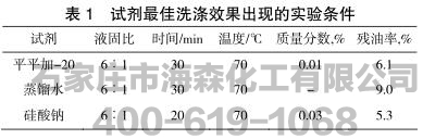 通过本实验可以得出硅酸钠在液固质量比为6︰1,搅拌温度为70℃,搅拌时间为20min,质量分数为0.03%,静置时间为4h的最佳条件下处理效果最好,残油率为5.3%。但其质量分数较