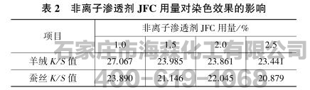 渗透剂JFC用量对染色效果的影响见表2。