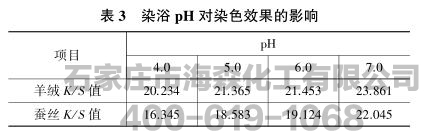 由表3可以知道,在试验中随着染浴pH的增大,羊绒和蚕丝的表面色深值都有所增加。其主要原因是pH增大对蚕丝纤维溶胀有积极作用,所以对提高蚕丝的上染率很有效果,但是pH增高对羊绒纤维会造成损伤。通过对数据的分析,确定最佳的染浴pH为7.0。