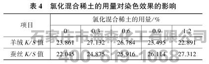 渗透剂JFC2.0%,硫酸铵5%,元明粉2%,pH7.0,染色温度95℃,保温时间40min。氯化混合稀土的用量对染色效果的影响见表4。