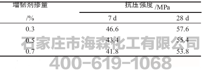 在相同的混凝土配合比基础上,通过在混凝土中掺入胶凝材料质量的0.3%、0.5%、0.7%的增韧组分,研究增韧组分对混凝土抗压强度的影响,试验结果如表9所示。