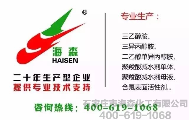 石家庄市海森化工有限公司坐落于河北省省会石家庄,公司成立于1993年。经过二十多年的艰苦创业,现已发展成为科、工、贸一体化,内外贸相结合的专业精细化学品研发制造企业。主要生产:三乙醇胺系列;聚羧酸减水剂单体系列、聚羧酸减水剂母液系列;三异丙醇胺系列;二乙醇单异丙醇胺系列;含氟表面活性剂系列;聚乙二醇(PEG)系列、吐温系列、平平加系列;脂肪醇聚氧乙烯醚等各种非离子表面活性剂;水泥助磨剂母液、建筑添加剂等。