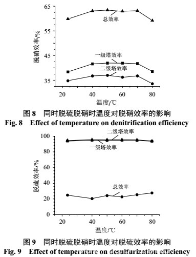 三乙醇胺)含量 0.01%(质量比),NOx 体积含量 900´10-6 左右,氧化度 6.8%,SO2 体积浓度在 1 000´10-6 左右时,研究温度(室温至 80℃)对脱硫脱硝效率的影响,试验结果如图 8、9 所示。