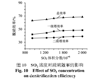 图 14 为存在 SO2 的条件下,NOx 浓度对 NOx 的去除效率的影响情况。对比图 14 与尿素溶液单独脱硝的效率曲线(如图 11)可发现,相同 NOx 浓度下,加入 1 000´10-6SO2 可使总脱硝效率增加 4%~5%。再次证明 SO2 的存在对尿素溶液吸收 NOx 的反应有一定的协同促进作用。