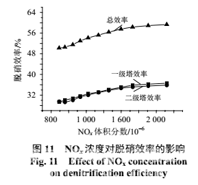 三乙醇胺溶液单独脱硝的试验研究(如图 11 所示),发现在相同试验条件下,烟气中 NOx 体积浓度为 1 000×10-6 时,加入 1 000´10-6SO2 比不加 SO2 的脱硝效率增加了约 5%~6%, 达到 64%,这说明 SO2 的存在对尿素溶液吸收 NOx 的反应有协同促进作用。此外,由图 10 可看出, 一级塔脱硝效率随 SO2 体积浓度由 42% 增至48.5%,增幅较大,而二级塔脱硝效率增幅较小, 只增加了 2%左右,这是因为 94%以上的 SO2 在一级塔中被尿素溶液吸收,进一步说明 SO2 的存在对NOx 吸收反应的促进作用显著。