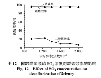 图 12 为存在 NOx 条件下,SO2 浓度对 SO2 的去除效率的影响情况。由图 12 试验结果可看出,脱硫效率基本保持在 95%以上,与尿素溶液单独脱硫时(如图 7)的效率曲线相比,脱硫效率比单独脱硫时增加了 1%~3%。从图 12 可看出,一级效率曲线几乎接近总效率曲线,一级塔脱硫效率可达到94.5%以上,这说明烟气中的 NOx 对尿素溶液吸收SO2 的反应也有一定的协同促进作用。