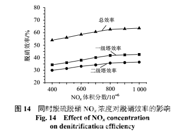 从图 13 可看出,脱硫效率维持在 95%以上, 脱硫效率比单独脱硫时(如图 7)增加了 1%~3%;随着 NOx 浓度增大,总脱硫效率有些微提高,基本上影响不大。然而,一级脱硫效率曲线越来越接近总效率曲线,说明 SO2 在一级塔内基本上被完全吸收。
