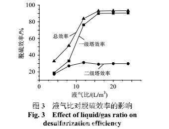(2)随着液气比的增大,脱硫效率增大,当液气比大于 16 L/m3 时,脱硫效率增至 92%,基本不再变化。