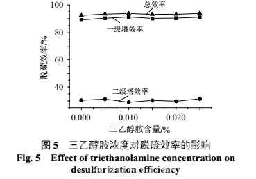 三乙醇胺后的脱硫效率都在 92%左右,且脱硫效率基本不随