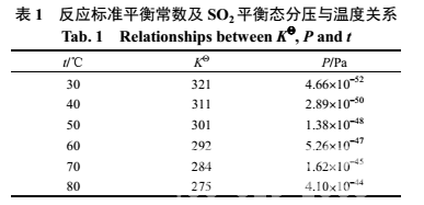 尿素溶液吸收 SO2 的反应为放热反应,考虑到该反应为气液接触反应,设计试验吸收液温度在常温80 ℃之间。通过热力学计算,得到不同温度下反应(2)的标准平衡常数 KQ以及SO2 的平衡分压 P, 见表 1。