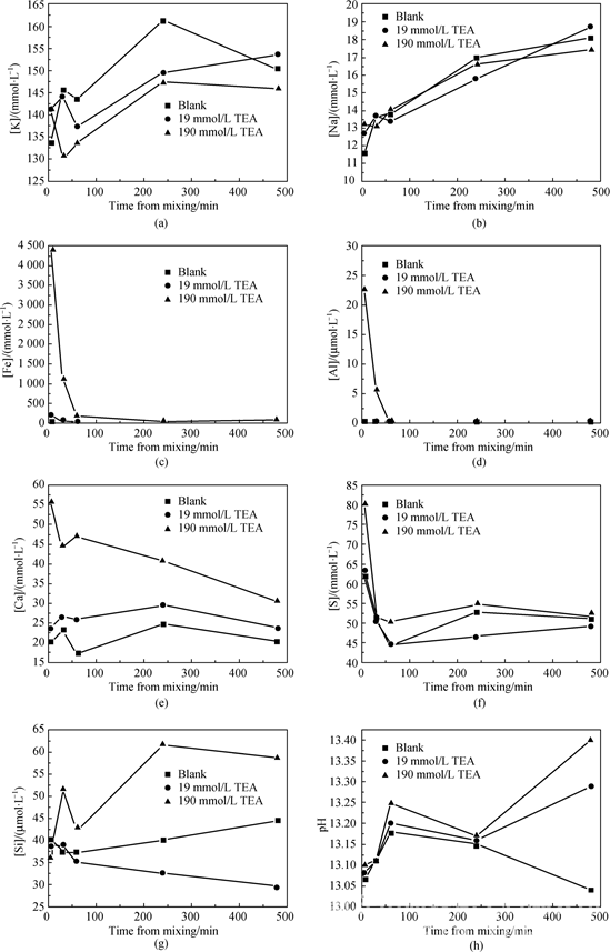3) TEA 明显提高水化水泥浆体液相中的 Fe、
