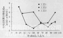 从前面的分析可知,工艺 1 和工艺 2 合成的聚羧酸减水剂平均组成 M 基本相同,但是每 2 个监测点内聚合物的平均组成 m 存在很大的差异(见图 5)。因此,我们认为是聚合物的组成对产品性能起决定性作用,工艺 2 使聚合物的 m 值较大的比例偏高,即羧基含量偏高。根据减水剂的分散机理,减水剂分子中的羧基容易在水泥颗粒表面吸附,但过高的比例反而会降低聚合物的分散性,因此匀速滴加工艺比变速滴加工艺合成的减水剂对水泥的分散性能更优异。综上,聚羧酸减水剂的工业化生产中要严格控制生产工艺,否则对产品的性能会有很大的影响。