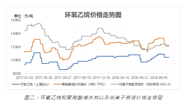 我们再来看环氧乙烷及其主要的两个下游应用领域的价格走势关系图,从下图一年来价格数据可以看出,三个产品的价格关系走势极其一致,特别是环氧乙烷和聚羧酸减水剂单体几乎保持了高度一致。