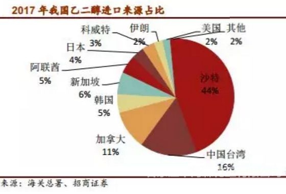 2016年全球乙二醇产能2137万吨,产量2651万吨,整体开工率84.8%,近10年全球乙二醇消费增速约4.67%,整体开工率82~88%之间波动。我国、中东是近几年全球乙二醇产能增长的主要地区,未来我国和美国将成为乙二醇产能的主要增长地区。我国占全球乙二醇消费量的50%,产量占比仅24%,中东产量占比30%,而消费占比仅4%,产销的极不平衡导致全球乙二醇贸易量占总消费量的比例达到35%,我国和中东分别为最大的进口和出口地区。