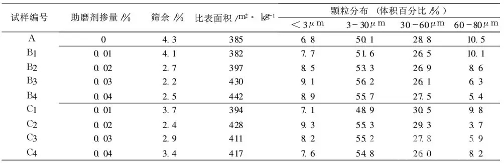 按熟料∶矿渣∶石膏 =70∶25∶5配料,试验量 3 kg。助磨剂按 50浓度和设定掺量滴加,试验分成3组, A试样不掺助磨剂,B组试样掺入三乙醇胺,C组试样掺入乙二醇。各组物料拌和均匀后入500 ×500试验小磨粉磨25 min。出磨水泥用 0.08 mm标准筛 、DBT-127勃氏比表面积仪和KF-9型激光粒度分析仪进行细度测试,并进行水泥胶砂强度性能测试。水泥细度按 GB/T1345 -1991《水泥细度检验方法(80μm筛筛析法 )》,水泥比表面积按 GB/T8074 -1987 《水泥比表面积测定方法 (勃式法)》,水泥胶砂强度按 GB/T17671 -1999 《水泥胶砂强度检验方法 (ISO)》。水泥标准稠度用水量 、 凝结时间和安定性按 GB/T1346 -2001 《水泥标准稠度用水量 、 凝结时间和安定性检验方法》。