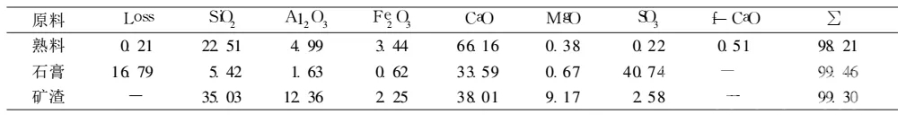 熟料采用湿法回转窑水泥熟料, 石膏用其生产用石膏。矿渣采用粒化高炉矿渣 。它们的化学成分见表 1。