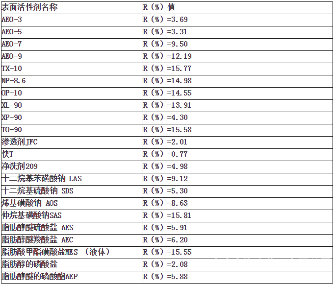 R值越大,表明净洗能力越强,该测试标准可用来表征表面活性剂对一般污垢的去除,不适用于反映油脂和蜡质的去除能力。
