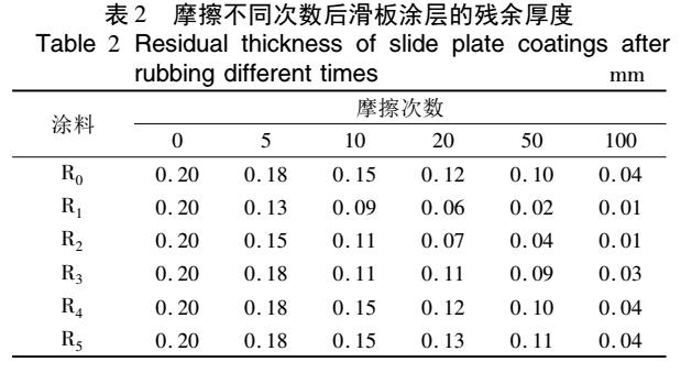 摩擦磨损试验后滑板涂层的残余厚度见表 2,其中R0为日本涂料。可以看出,