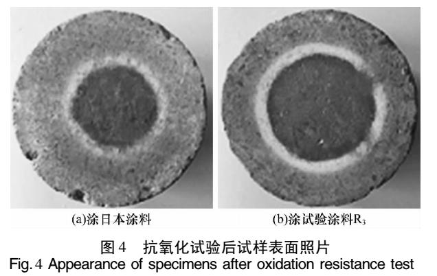 抗氧化试验后试样的照片见图 4。对比发现,涂覆涂料 R3 的试样,其未氧化面积明显大于涂覆日本涂料的。