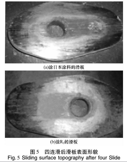 为了进一步验证涂料 R3 的实际使用效果,将分别涂有试验涂料 R3 和日本涂料的滑板在某钢厂进行了四连滑试验,试验后滑板表面形貌见图 5。对比发现,涂有日本涂料的滑板表面侵蚀明显,而涂有涂料R3 的滑板表面侵蚀较轻微。
