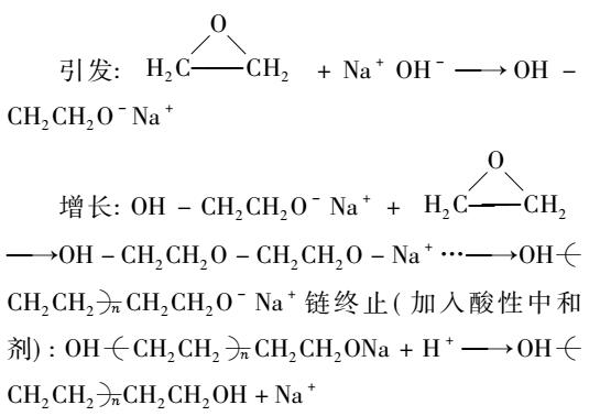 聚乙二醇的生产是由环氧乙烷与乙二醇,在碱性催化剂条件下,在间歇反应釜或半自动外循环反应器内进行加成聚合得到的,反应按阴离子聚合机理进行: