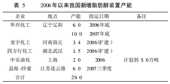 近几年我国的天然脂肪醇装置的产能也在迅速扩张 ,表 5中列出自 2006年以来新建的脂肪醇装置的产能。可见, 两年内将新增产能 29万吨。有统计报道 , 2005年我国脂肪醇产量为 11.3万吨 , 2006年为 14.4万吨 ,而 2007年估计将突破 20万吨 , 意味着新增