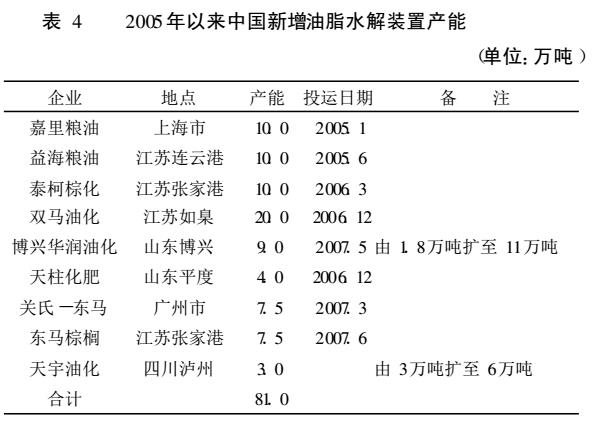 表 4中列出了 2005 年以来中国新增或扩建的油脂水解装置。仅仅这些已投运的新建装置的产能已在 80万吨以上 , 几乎是 2003年中国原有产能的一倍 ;而且,这里尚未包括一些产能在 3万吨以下的小装置。据笔者了解 ,上述新的生产装置一般运行情况良好。这意味着新增