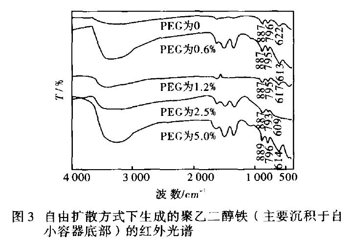 聚乙二醇铁在890 cm- 1与700 cm- 1左右均有特征吸收,与文献[ 2,3]报道的β-FeOOH的红外光谱图相一致,说明