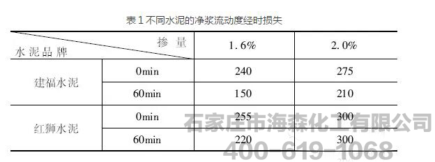 搅拌站通常采用净浆流动度及经时损失来初步检验外加剂与水泥的适应性,也是最简单最快捷的方法。试验选用某市售聚羧酸低浓减水剂PC、红狮水泥P.O42.5、建福水泥P.O42.5,举例说明聚羧酸与水泥适应性,结果如见表1