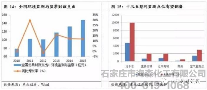 b.十三五期间监测点位增加有望助推监测行业高速增长。根据国家认监委统计数据与预测,2013年我国检测检验市场规模已达1678亿,从全国公共财政监测与监察支出来看,13-15年监测与监察支出都维持10-15%的增速。
