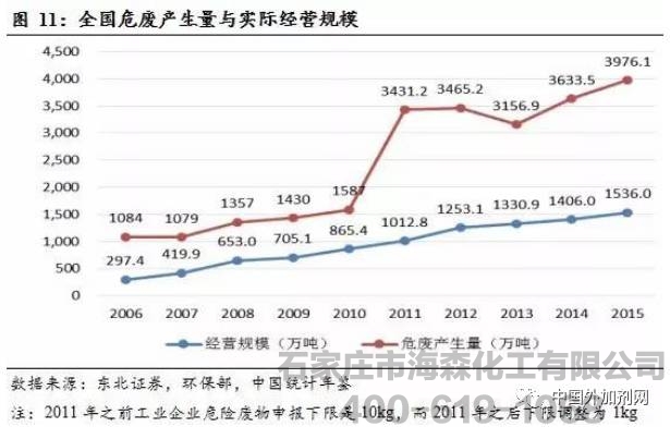 a.危险废物的产生量呈现不断上升趋势,处置缺口较大。根据中国统计年鉴,全国危险废弃物产生量与实际经营规模逐年增加,2015年全国危险废物产生量达3976万吨,较2014年产生量3634万吨,增长9.4%,但自2011年环保改变统计口径以来,每年仍存在2000万吨左右的危险废物处置缺口。